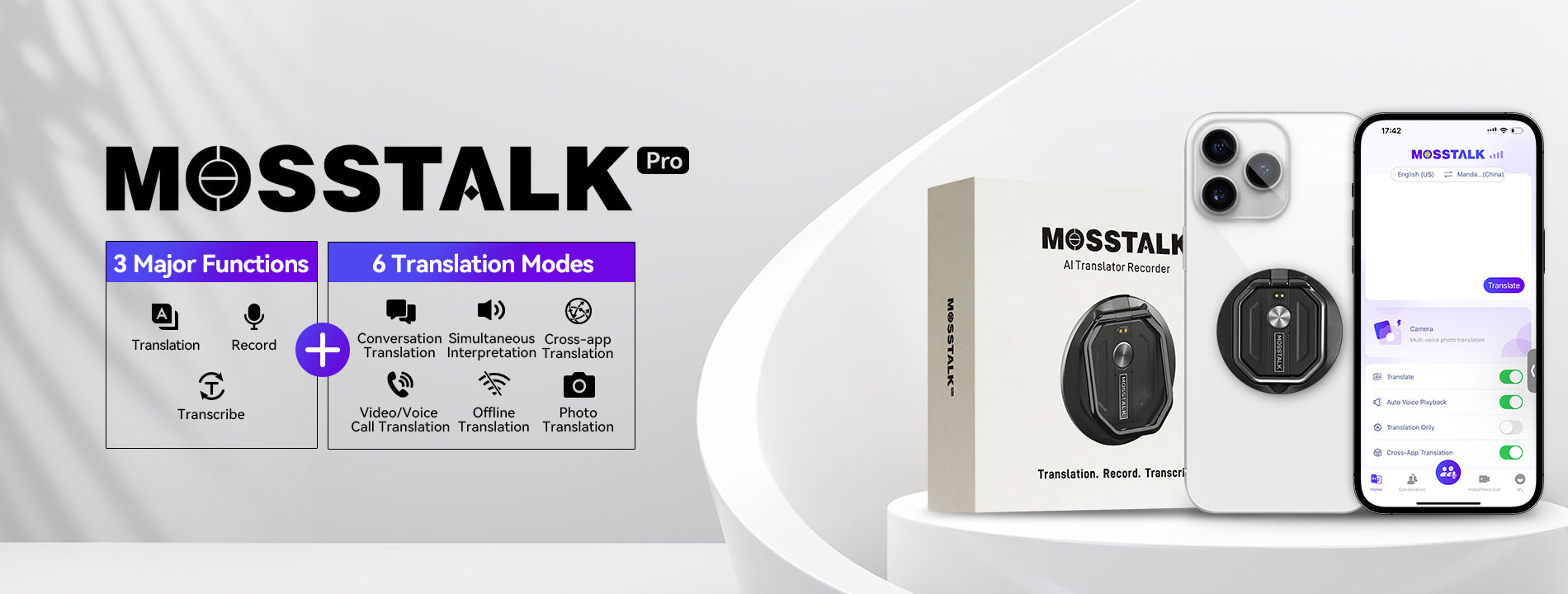 Mosstalk Pro supports offline translation for 12 languages, even in the absence of an internet connection. This feature allows users to communicate easily while traveling or in remote areas, eliminating concerns about connectivity issues. The offline translation capability ensures convenient communication anytime, anywhere, enhancing the product's practicality.
